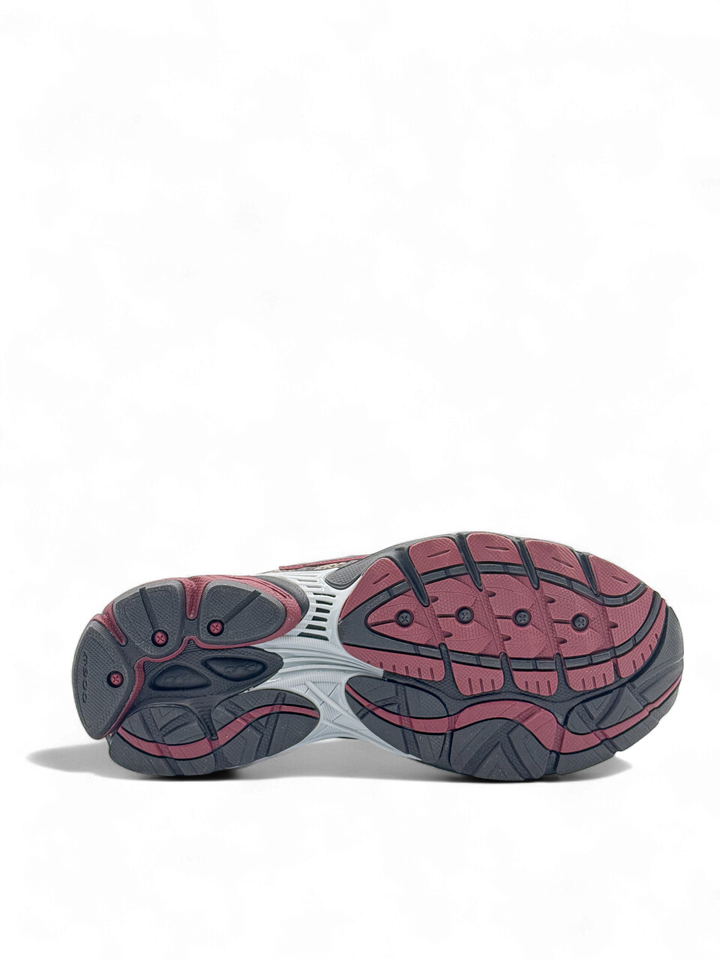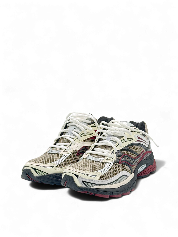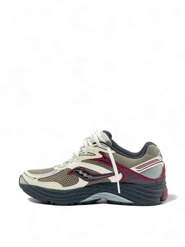 La tige multi-couches combine mesh respirant et empiècements synthétiques superposés, assurant maintien, ventilation et durabilité. Le coloris "Tan Maroon" marie des tons beige sableux à des accents bordeaux profonds, créant un contraste subtil et raffiné qui apporte caractère et sophistication à la silhouette.